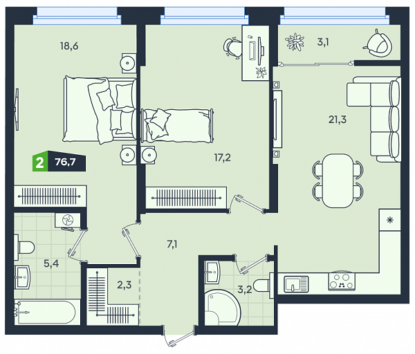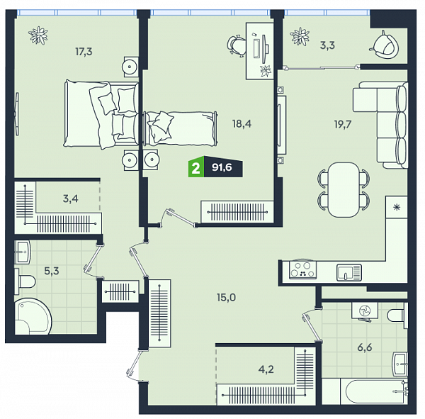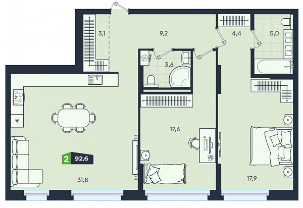 Двухкомнатные квартиры - это бестселлер среди квартир квартала бизнес-класса Clever park. Площадь квартир варьируется от 62,14 до 92,6 м2 и включает в себя две отдельный спальни, просторную кухню гостиную, теплую лоджию, два санузла, а также зоны для организации мест хранения. Это отличный вариант базовой семейной квартиры. Квартиры с большими окнами и видом на набережную и город имеют высокие потолки 2,9 метра. Квартиры в Clever park сдаются с отделкой white box или с современной и лаконичной чистовой отделкой.